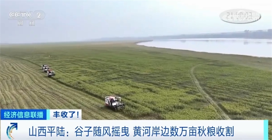 山西平陸:谷子隨風(fēng)搖曳 黃河岸邊數(shù)萬畝秋糧收割
