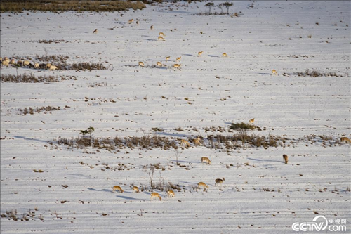 青海湖畔成群普氏原羚雪中覓食。