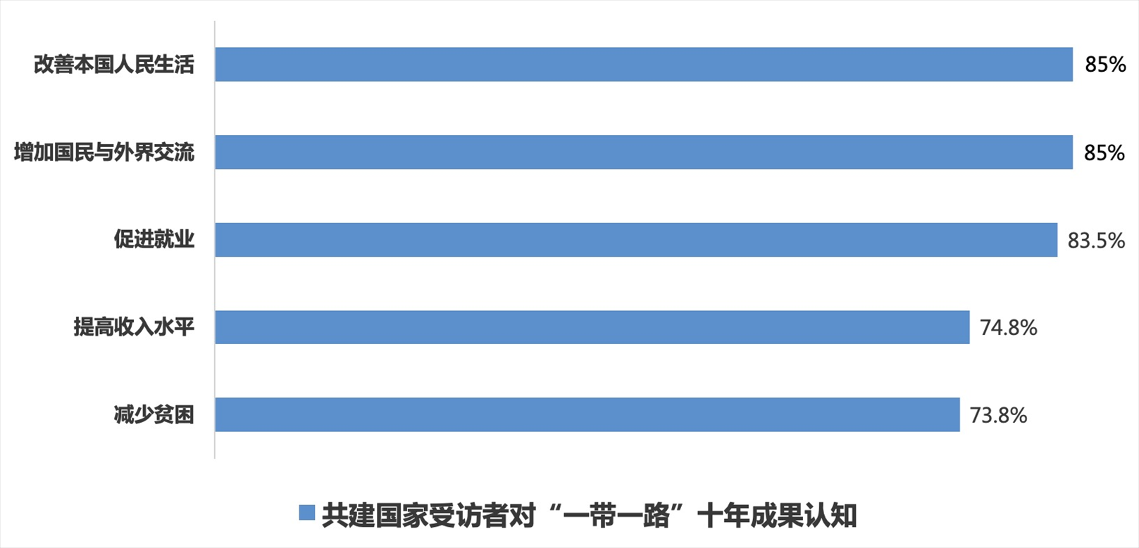 “一帶一路”倡議下一個個“惠而實”的民生工程、民心工程,為各國人民帶來實實在在的獲得感、幸福感和安全感,85%的共建國家受訪者認(rèn)為“一帶一路”切實改善了本國人民的生活;85%的共建國家受訪者認(rèn)為通過“一帶一路”民眾獲得了更多與外界交流互鑒的機(jī)會;分別有83.5%、74.8%和73.8%的共建國家受訪者認(rèn)可共建“一帶一路”在促進(jìn)就業(yè)、提高居民收入水平和減少貧困方面的作用;86.5%的共建國家受訪者認(rèn)為“一帶一路”倡議和“以人民為中心”的理念高度契合,惠及全球民眾的愿景正在逐步變?yōu)楝F(xiàn)實。