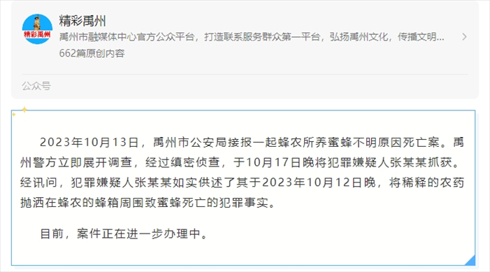 ·河南禹州警方通報(bào)“蜂農(nóng)60箱蜜蜂遭投毒死亡”:已抓獲嫌疑人。