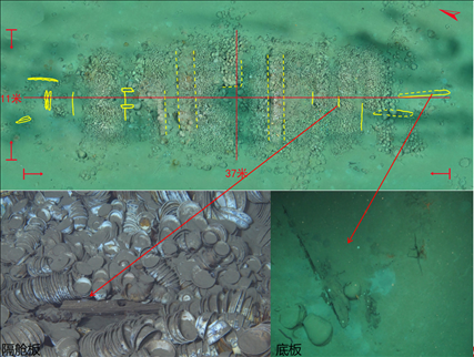 沉船遺址水深約30米,主體區(qū)域殘存有木質(zhì)船體和成摞擺放的船貨堆積,范圍約300平方米??脊虐l(fā)掘發(fā)現(xiàn),沉船船體殘長約16.95米,最寬處保存約4.5米,殘存9道隔艙板和10個(gè)船艙,單層板結(jié)構(gòu),發(fā)現(xiàn)桅座、龍骨板、龍骨補(bǔ)強(qiáng)材以及舭龍骨等船體構(gòu)件。
