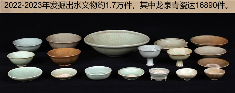發(fā)掘出水文物標(biāo)本約1.7萬件,主要為龍泉青瓷和陶罐、鉛錘、印章等船上生活、航海相關(guān)文物。其中龍泉青瓷數(shù)量達(dá)到1.6萬余件,器形包括碗、盤、碟、盞、洗、缽、香爐和高足杯等,年代為元代晚期,為典型的外銷貿(mào)易瓷。結(jié)合溫州朔門古港的考古發(fā)現(xiàn),推測該沉船可能是從溫州港出海前往東南亞的民間貿(mào)易商船。