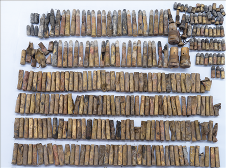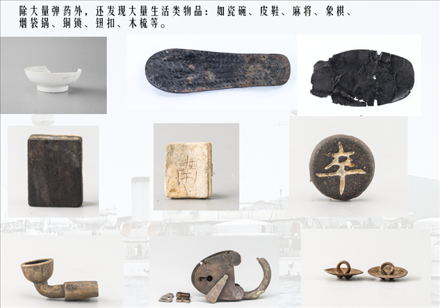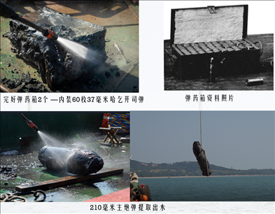 靖遠(yuǎn)艦于舯部發(fā)現(xiàn)2箱完好的37毫米哈乞開司炮彈、艏部發(fā)現(xiàn)1枚210毫米主炮開花彈。