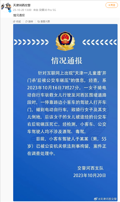 ·天津警方通報“兒童遭開門殺后被公交碾壓死亡”:小客車駕駛?cè)艘驯恍淌戮辛?,案件正在調(diào)查處理中。