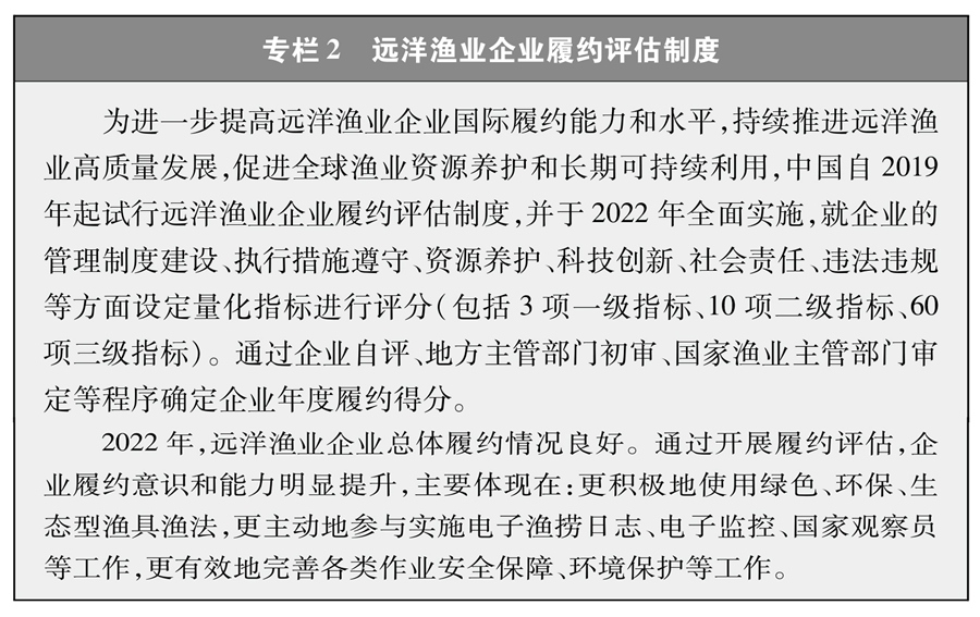 遠(yuǎn)洋漁業(yè)企業(yè)和漁船是履行國(guó)際公約、合法合規(guī)從事漁業(yè)生產(chǎn)的主體。2022年中國(guó)正式實(shí)施遠(yuǎn)洋漁業(yè)企業(yè)履約評(píng)估制度,將企業(yè)履約成績(jī)與行政審批、政策支持等掛鉤,通過正向激勵(lì)、反向倒逼的方式,引導(dǎo)企業(yè)不斷完善管理制度,嚴(yán)格執(zhí)行管理措施,避免發(fā)生違規(guī)行為,切實(shí)提高履約能力。這一制度有力促進(jìn)了遠(yuǎn)洋漁業(yè)企業(yè)規(guī)范管理和國(guó)際履約,得到了各方關(guān)注和廣泛認(rèn)可。