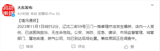 ·遼寧省沈陽(yáng)市大東區(qū)遼沈二街59號(hào)三門一推拿理療店發(fā)生爆燃,店內(nèi)一人受傷。