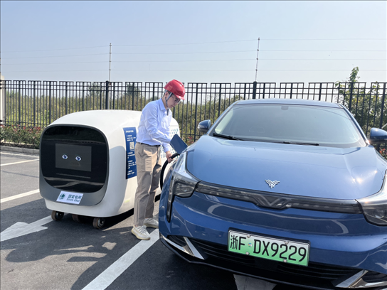 ?2023年10月17日,國網(wǎng)浙江電力工作人員在烏鎮(zhèn)使用首臺智能移動充電機(jī)器人為新能源汽車充電。新華網(wǎng)發(fā) 沈佳煒 攝