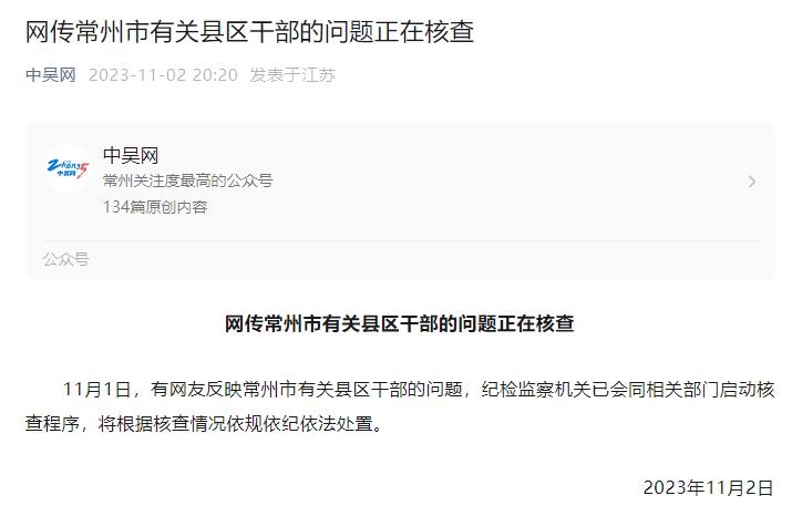 央視網(wǎng)消息:據(jù)“中吳網(wǎng)”微信公眾號消息,11月1日,有網(wǎng)友反映常州市有關(guān)縣區(qū)干部的問題,紀(jì)檢監(jiān)察機關(guān)已會同相關(guān)部門啟動核查程序,將根據(jù)核查情況依規(guī)依紀(jì)依法處置。