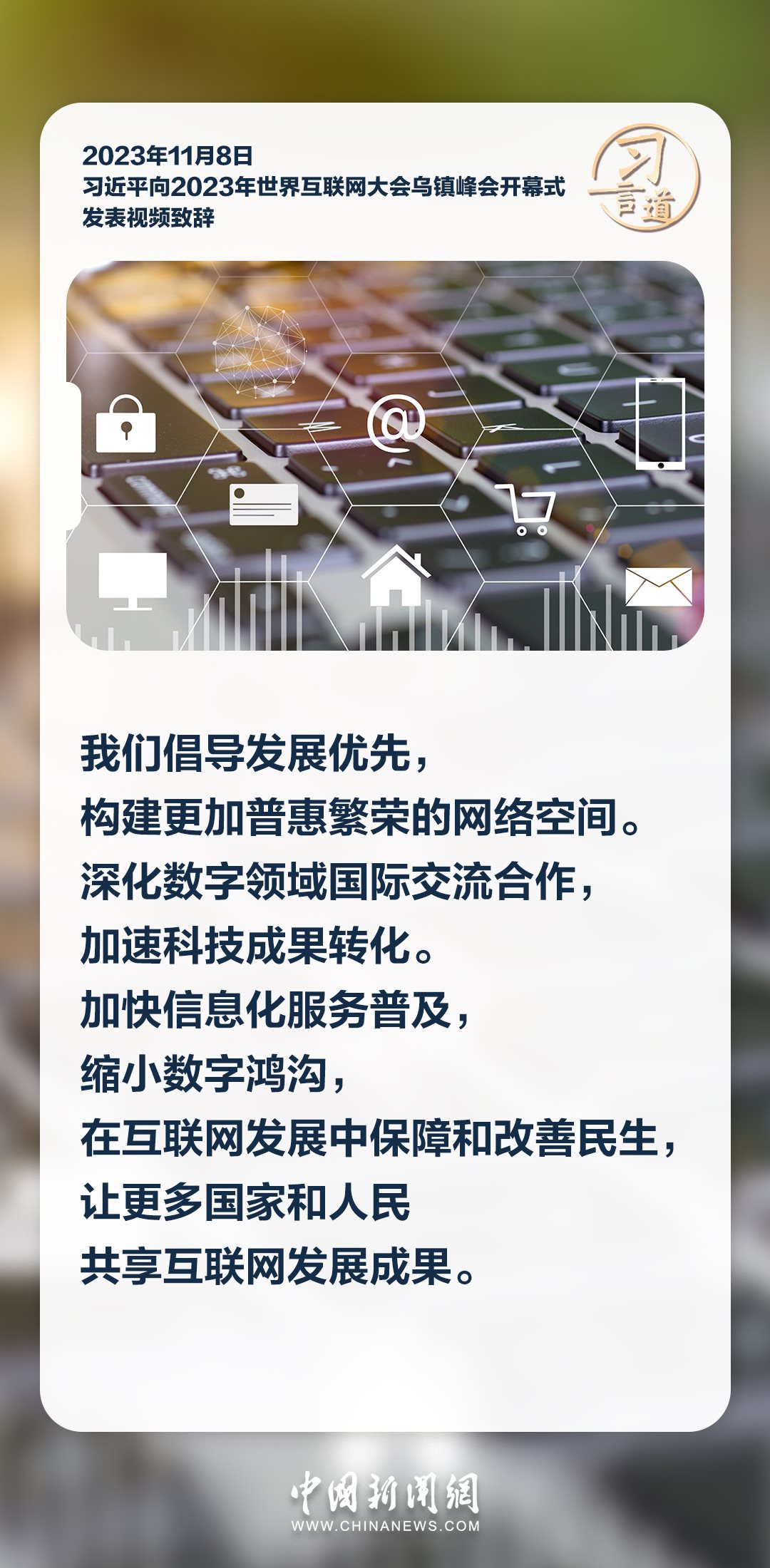 11月8日上午,國(guó)家主席習(xí)近平向2023年世界互聯(lián)網(wǎng)大會(huì)烏鎮(zhèn)峰會(huì)開(kāi)幕式發(fā)表視頻致辭。習(xí)近平指出——