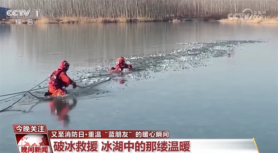 這是在今年年初,冒著凜冽刺骨的低溫,匍匐前進的消防員正在接近落冰者,冰水的浸泡已經(jīng)使落冰者失去了自主行動的能力,只能靠消防員拖拽向前。