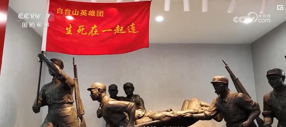 軍事記者 張喬普:在這個(gè)旅的旅史長(zhǎng)廊,在我身旁的這些櫥窗,我看到了包括“生死在一起”連在內(nèi)的,一共17個(gè)英模單位的旗幟。這一面面鮮紅的戰(zhàn)旗,見(jiàn)證、記錄了這個(gè)旅代代官兵一路從抗日戰(zhàn)爭(zhēng)時(shí)期到抗美援朝浴血奮戰(zhàn)、英勇無(wú)畏的戰(zhàn)斗足跡。其中最引人注目的就是我身旁的這面“白臺(tái)山英雄團(tuán)”的戰(zhàn)旗。這面戰(zhàn)旗曾參加國(guó)慶70周年閱兵,在天安門(mén)廣場(chǎng)接受黨和人民的檢閱。而她的精神內(nèi)核,就是“生死在一起”。