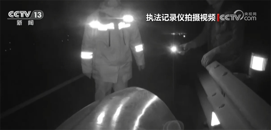 再來看前些天發(fā)生在京臺高速山東德州段的這一幕。晚上八點多,德州高速交警在轄區(qū)巡查時,發(fā)現(xiàn)在京臺高速往濟南方向的這一處內(nèi)側(cè)行車道上,掉落了一個大型管道,前方不遠(yuǎn)處有一輛大型貨車正停在應(yīng)急車道內(nèi),而貨車駕駛?cè)苏驹谥醒胱o欄內(nèi),用手電筒提醒過往車輛。由于晚上途經(jīng)的大都是大型車輛,夜間視距較差,情況十分危險,現(xiàn)場交警分工配合,通過多次嘗試終于跑到了遺落物的旁邊進行處置。