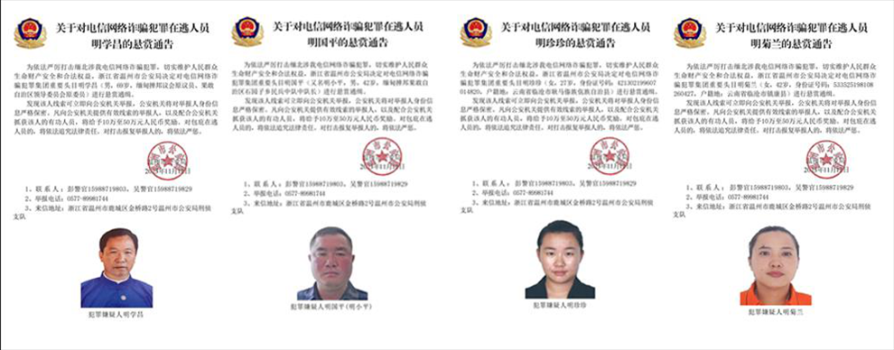 ·公安機(jī)關(guān)公開通緝緬北果敢自治區(qū)電信網(wǎng)絡(luò)詐騙犯罪集團(tuán)重要頭目明學(xué)昌、明國(guó)平、明菊蘭、明珍珍。