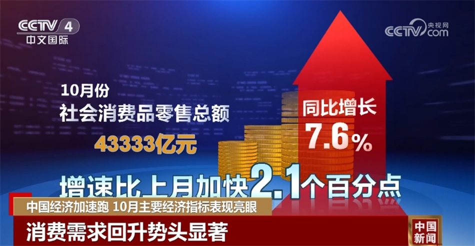 央視網(wǎng)消息:來關(guān)注中國經(jīng)濟10月報。國家統(tǒng)計局昨天(11月15日)發(fā)布了10月份經(jīng)濟主要指標。數(shù)據(jù)顯示,隨著宏觀調(diào)控政策持續(xù)發(fā)力顯效,全國生產(chǎn)供給穩(wěn)中有升,市場需求持續(xù)改善,就業(yè)物價總體穩(wěn)定,高質(zhì)量發(fā)展扎實推進,國民經(jīng)濟持續(xù)恢復(fù)向好。