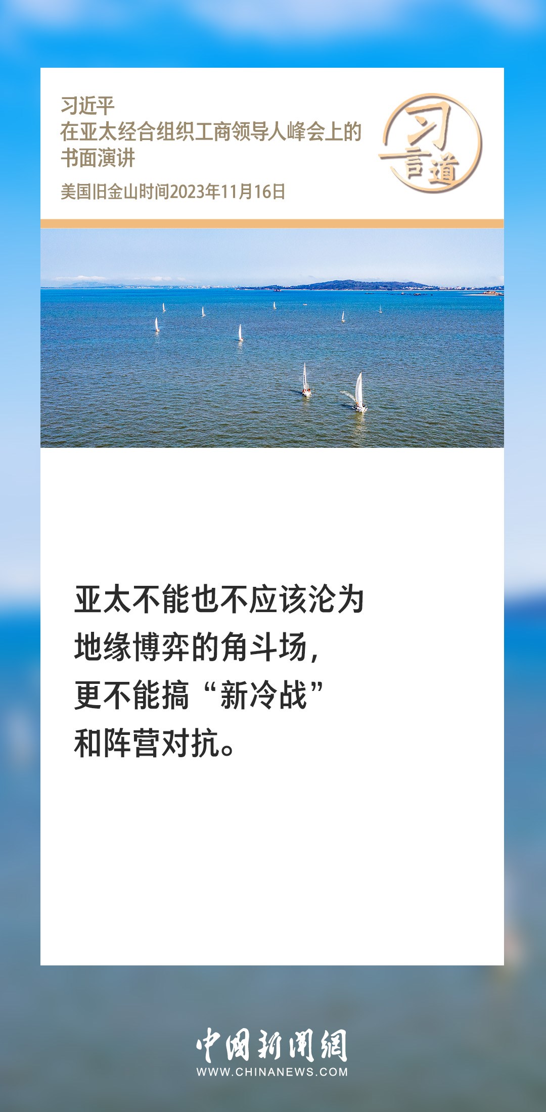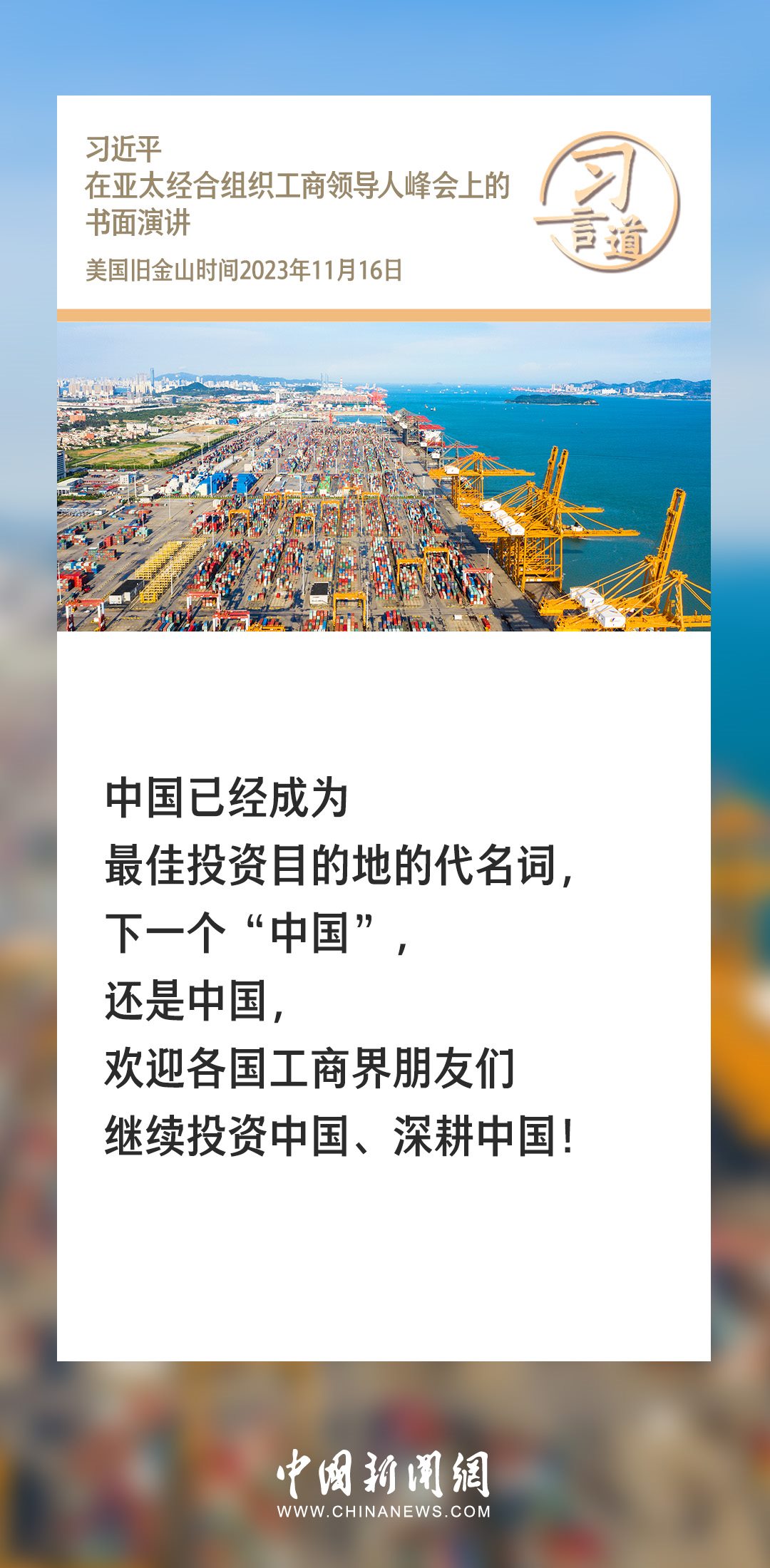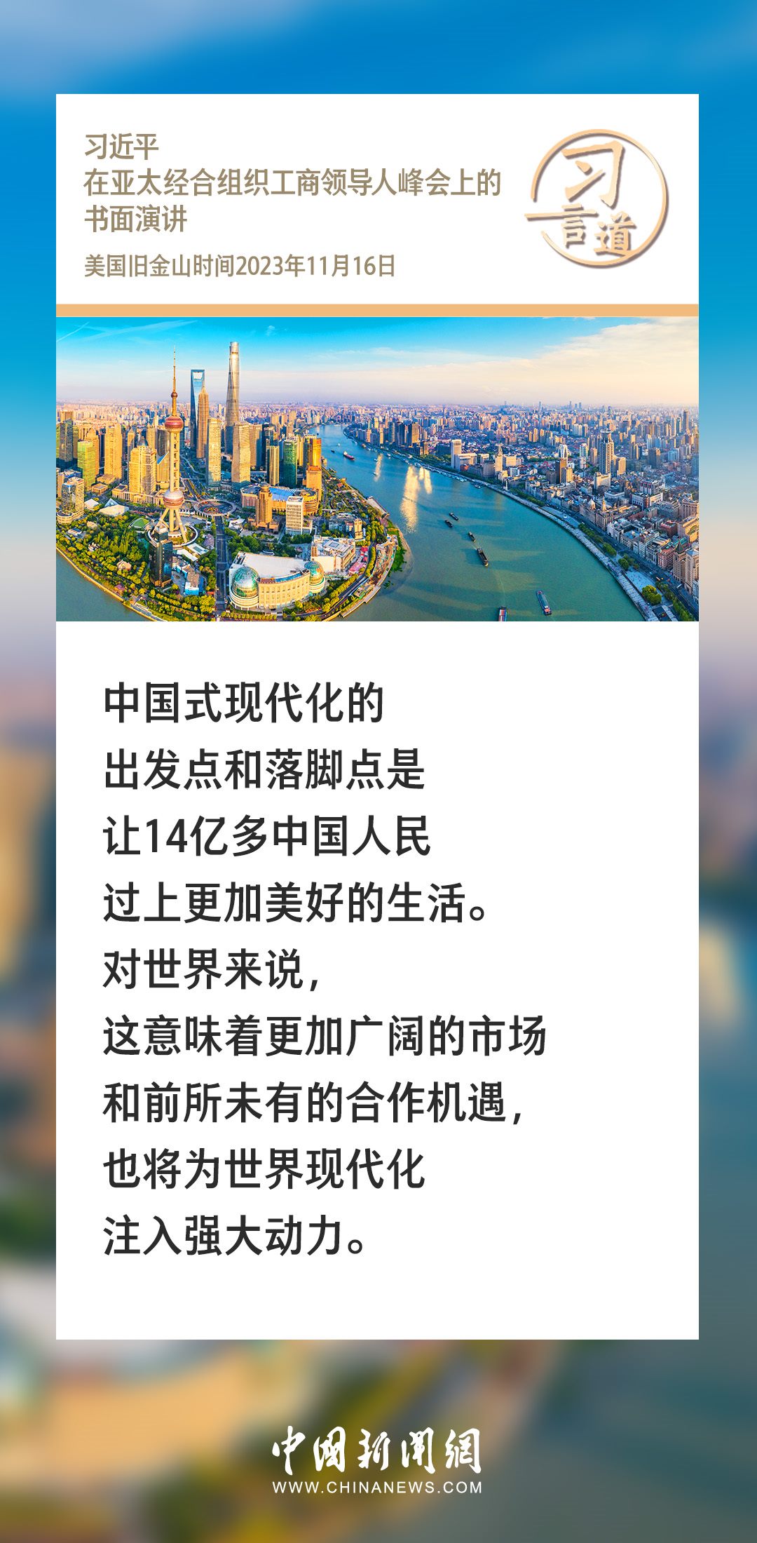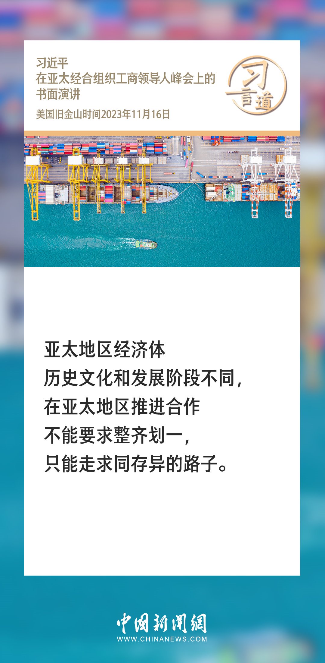 當?shù)貢r間11月16日上午,國家主席習(xí)近平向在舊金山舉行的亞太經(jīng)合組織工商領(lǐng)導(dǎo)人峰會發(fā)表題為《同心協(xié)力 共迎挑戰(zhàn) 譜寫亞太合作新篇章》的書面演講。習(xí)近平指出——