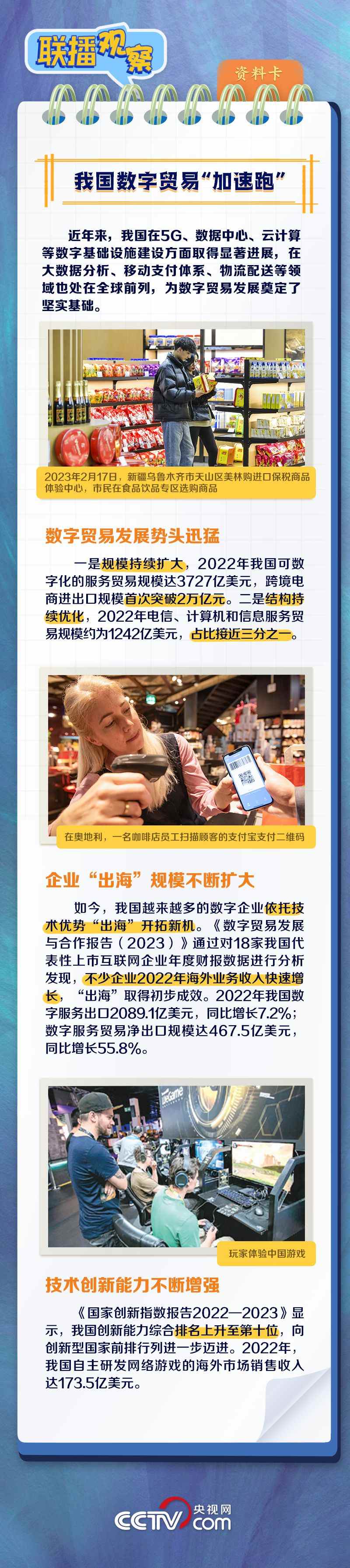 當(dāng)前,貨物貿(mào)易和服務(wù)貿(mào)易都呈現(xiàn)出不可逆的數(shù)字化轉(zhuǎn)型趨勢(shì)。什么是數(shù)字貿(mào)易?本屆數(shù)貿(mào)會(huì)有什么看點(diǎn)和亮點(diǎn)?我國(guó)數(shù)字貿(mào)易有何發(fā)展成果?央視網(wǎng)《聯(lián)播觀察》與您一同了解。
