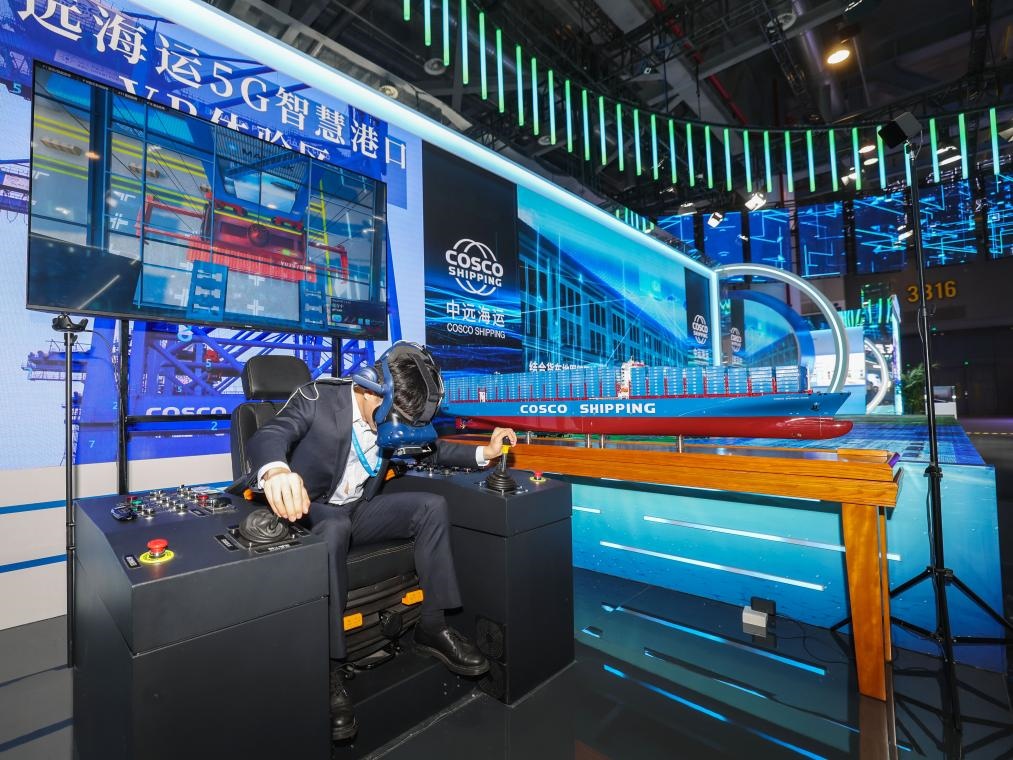 11月23日,在第二屆全球數(shù)字貿(mào)易博覽會上,工作人員戴上VR眼鏡,展示智慧港口遠(yuǎn)程操控吊車設(shè)備。新華社記者 徐昱 攝