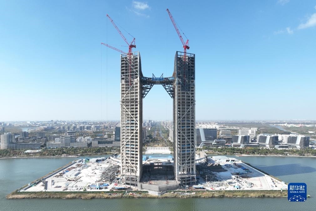 這是鋼結(jié)構(gòu)錐體提升完成的西島中銀金融中心項(xiàng)目南北塔樓(2023年11月24日攝,無人機(jī)照片)。新華社記者 方喆 攝