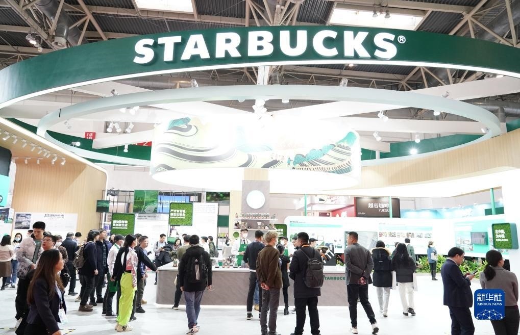 這是在首屆中國國際供應(yīng)鏈促進(jìn)博覽會(huì)健康生活鏈展區(qū)拍攝的星巴克展位(2023年11月28日攝)。新華社記者 任超 攝
