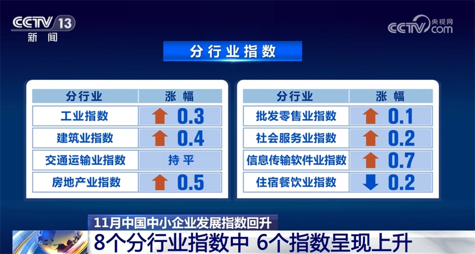 總臺(tái)央視記者 王雷:2023年的中國(guó)中小企業(yè)發(fā)展指數(shù)總體呈現(xiàn)出波浪式上升的走勢(shì)。通過(guò)對(duì)數(shù)據(jù)的分析,我們還發(fā)現(xiàn),隨著眾多中小企業(yè)加快產(chǎn)業(yè)、產(chǎn)品升級(jí),它們的競(jìng)爭(zhēng)力也在不斷增強(qiáng)。對(duì)比去年11月份和今年11月份的數(shù)據(jù),宏觀經(jīng)濟(jì)感受指數(shù)是分項(xiàng)指數(shù)中升幅最大的,一共上升了2.5點(diǎn)。