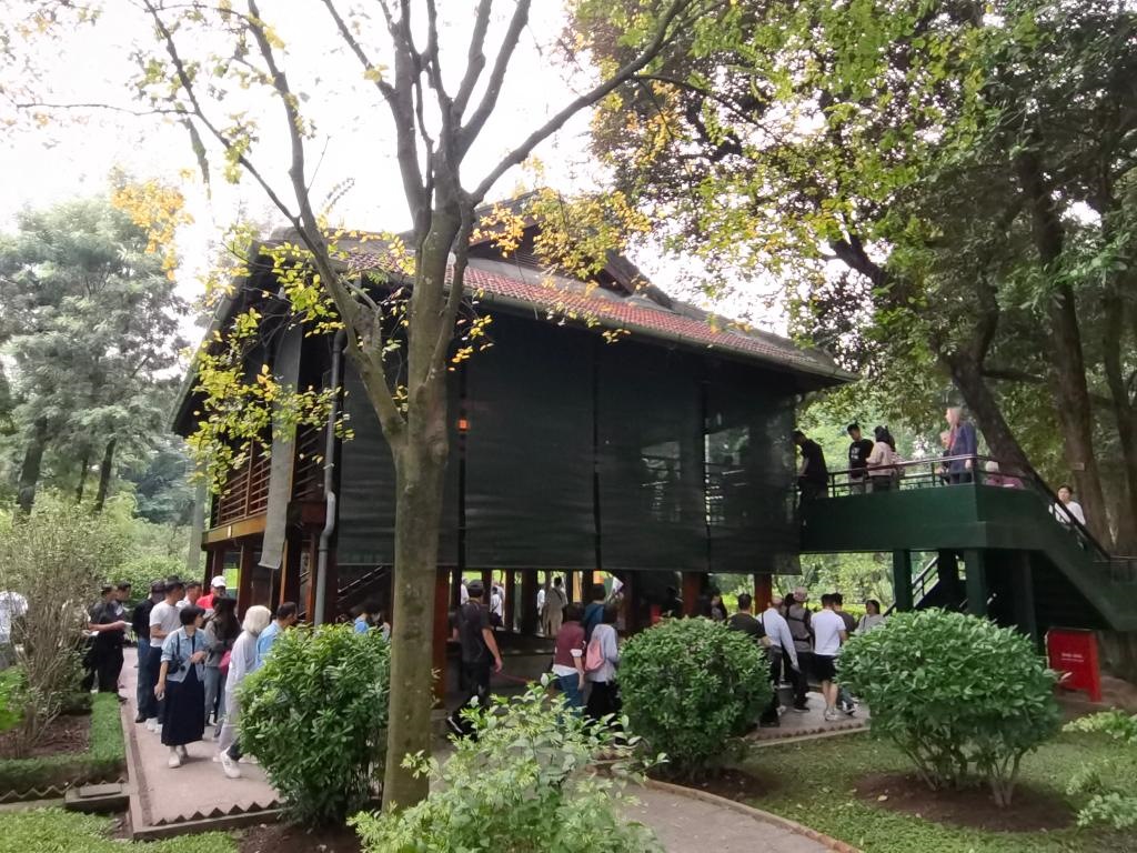 在河內(nèi)地標(biāo)巴亭廣場一側(cè),坐落著胡志明陵和胡志明故居。記者抵達(dá)廣場時,守衛(wèi)胡志明陵的儀仗兵正在舉行換崗儀式,眾多民眾和游客高舉相機(jī)或手機(jī),記錄下這莊嚴(yán)肅穆的一刻。胡志明陵北側(cè)的胡志明故居內(nèi),各國游客排起長隊(duì),在他曾長期居住和工作的高腳屋下駐足留影。