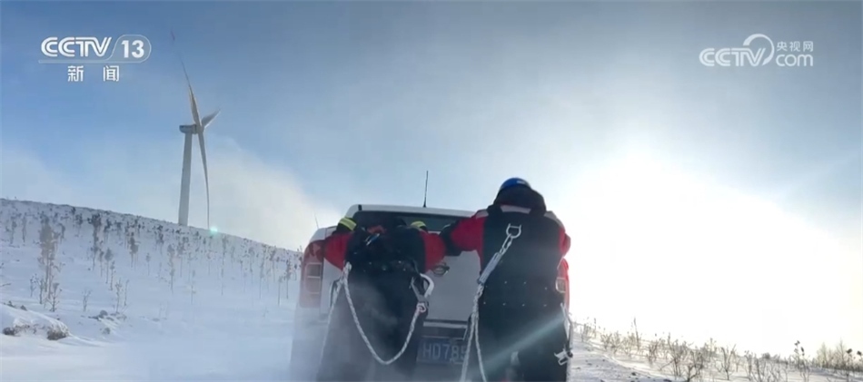 在河北張家口沽源縣,最高氣溫只有零下17攝氏度。華電冀北新能源馳盛風電場的運維員工,冒著寒風檢查線路覆冰情況,發(fā)現并消除線路覆冰101公里。