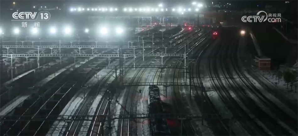 總臺央視記者 張叢婧:我這一下來,明顯感覺到冷了特別多,現在司機師傅就在這準備做換車頭的工作。工作人員告訴我,在這個編組站里,現在幾乎每隔10分鐘就會有一列車編好組往外發(fā)出。我在車站里走了一會,就感覺已經要被凍透了,大家可以看一下,現在這里的溫度是有零下將近24攝氏度。