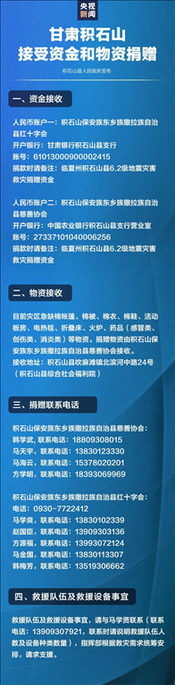 ·19日,甘肅臨夏州積石山縣發(fā)布公告,公布面向社會(huì)接受資金和物資捐贈(zèng)方式。