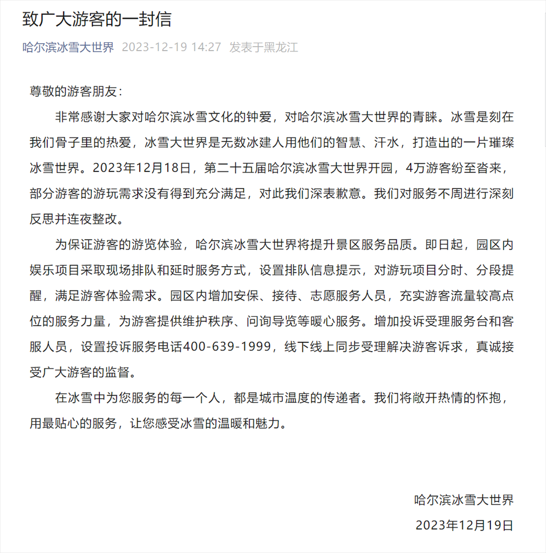 ·哈爾濱冰雪大世界開(kāi)園首日被喊退票,園區(qū)發(fā)文致歉:連夜整改。當(dāng)?shù)匚穆镁只貞?yīng)已去現(xiàn)場(chǎng)督導(dǎo)。