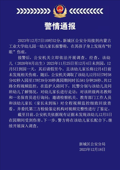 ·呼和浩特警方通報(bào)“幼兒身上發(fā)現(xiàn)有‘針眼’傷痕”:未發(fā)現(xiàn)在園期間受到傷害。