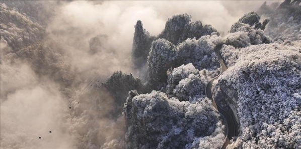 12月19日,湖南張家界國(guó)家森林公園天子山雪后初霽,山巒間銀裝素裹,云霧繚繞,美如畫卷。