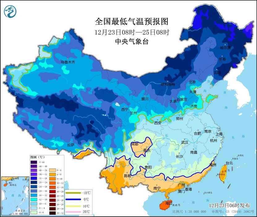 央視網(wǎng)消息:中央氣象臺12月23日06時(shí)發(fā)布低溫藍(lán)色預(yù)警:預(yù)計(jì),12月23日08時(shí)至25日08時(shí),內(nèi)蒙古河套地區(qū)、陜西北部、華北西部和中南部、東北地區(qū)南部、黃淮及其以南大部地區(qū)日最低氣溫或平均氣溫較歷史同期偏低5℃以上,其中,內(nèi)蒙古河套地區(qū)、遼寧北部、河北中南部、江南大部、華南北部等地的部分地區(qū)偏低7℃以上,最低氣溫0℃線將位于貴州西南部至華南北部一帶。