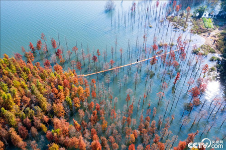 福建南平,延平區(qū)爐下鎮(zhèn)斜溪社區(qū)村洲頭島的落羽杉樹掩映閩江,色彩繽紛點綴冬日。