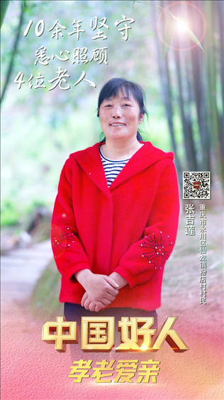 張吉蓮,女,1973年12月生,重慶市永川區(qū)仙龍鎮(zhèn)粉店村村民。1996年,張吉蓮與仙龍鎮(zhèn)張家村的凡時(shí)德結(jié)婚。在相繼為父親和奶奶養(yǎng)老送終后,張吉蓮將3位年邁體弱的叔叔接到自己家里照顧。在她的悉心照料下,幾位老人衣食富足,生活幸福。鄰里鄉(xiāng)親受其影響,逐漸形成了孝老愛(ài)親、守望相助的文明鄉(xiāng)風(fēng)。