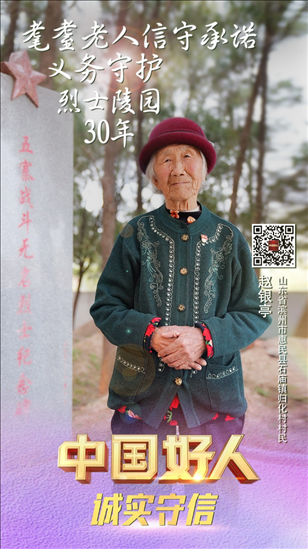 趙銀亭,女,1929年10月生,中共黨員,山東省濱州市惠民縣石廟鎮(zhèn)歸化村村民。趙銀亭是一位有75年黨齡的老黨員。1992年,當(dāng)?shù)亟⒘沂苛陥@,需要一位守陵人,63歲的趙銀亭主動(dòng)報(bào)了名。自此,她與丈夫搬到了距烈士陵園不過(guò)15米的舊屋居住。30多年來(lái),她堅(jiān)守信仰,守護(hù)烈士陵園,為前來(lái)參觀的人員講述英烈故事。