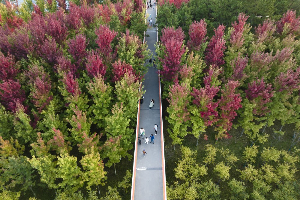 10月7日,市民在陜西西安雁南公園內駐足觀景(無人機照片)。