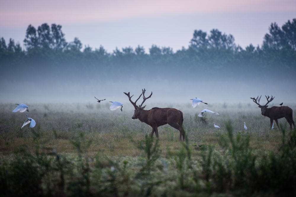 8月1日,兩頭麋鹿在湖北石首麋鹿國家級自然保護區(qū)內活動。