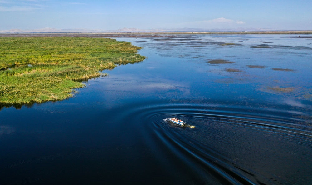 9月15日,在內蒙古烏梁素海湖面上,河湖濕地水環(huán)境保護與修復技術研究團隊成員乘坐快艇去采集湖水樣本(無人機照片)。