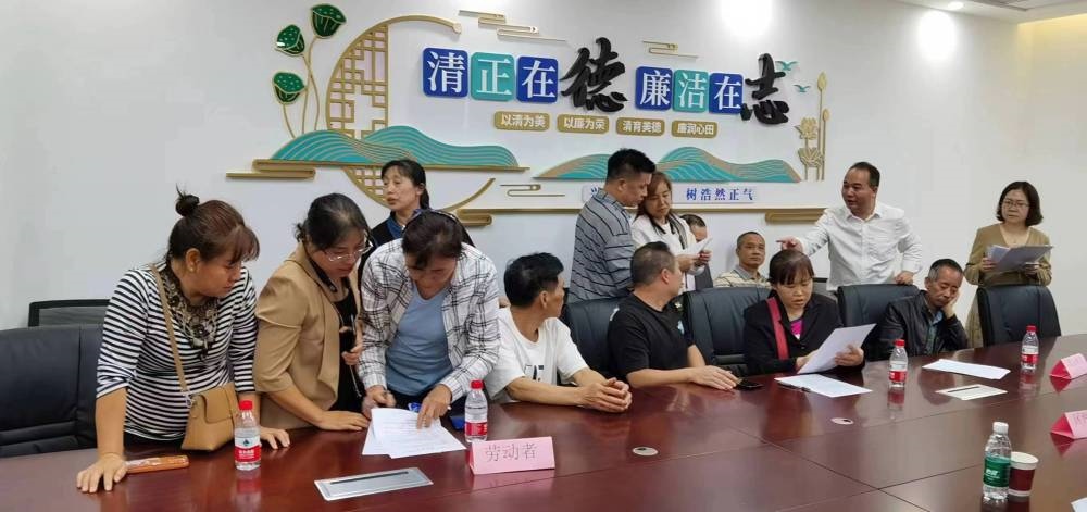 圖為廣州市白云區(qū)勞動(dòng)人事爭(zhēng)議仲裁院院長(zhǎng)李擁華(后排右二)在調(diào)解欠薪爭(zhēng)議現(xiàn)場(chǎng)。(廣州市白云區(qū)勞動(dòng)人事爭(zhēng)議仲裁院供圖)