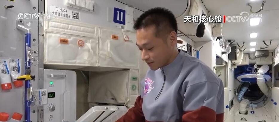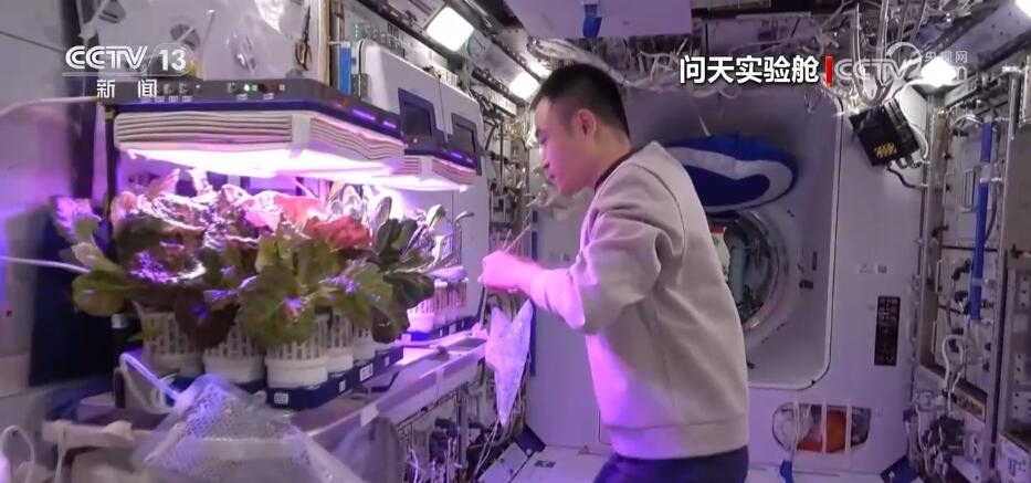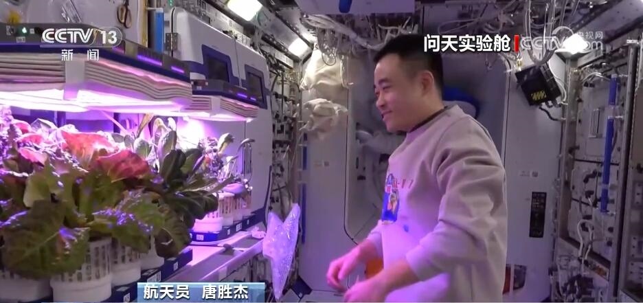 航天員 唐勝杰:你好,我正在對我們的櫻桃番茄進(jìn)行授粉。因?yàn)樘諞]有小蜜蜂,我就是那只小蜜蜂。大家看一看,這是我們的太空蔬菜,神十七乘組在“太空出差”期間,我們的太空菜園變得更大了,大家看看我們的蔬菜是不是長勢喜人?今天是新年的第一天,江新林為我們準(zhǔn)備了營養(yǎng)豐盛的太空午餐,但是我覺得今天應(yīng)該再增加一點(diǎn)綠色的、新鮮的蔬菜,午餐就會變得更豐盛了。大家可以看一看,看看我們的櫻桃番茄。誒,拿這兩杯,今天中午我們就吃這兩杯。