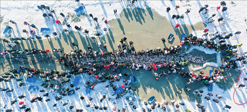 游客在查干湖冰面上觀看冬捕(2023年12月28日攝) 張楠攝/本刊