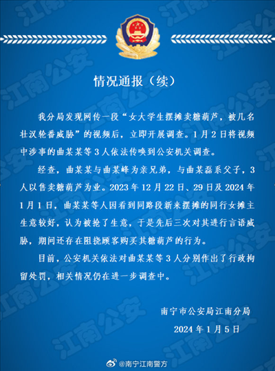 ·廣西南寧警方再通報(bào)“女大學(xué)生擺攤賣糖葫蘆被壯漢威脅”:3人被行拘。