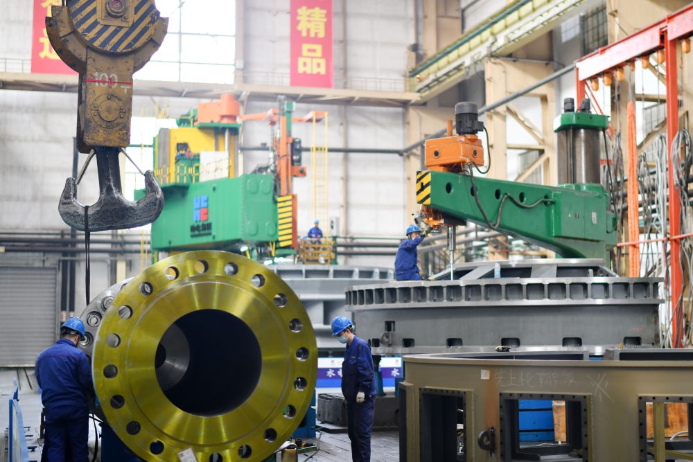 工人在哈電集團哈爾濱電機廠有限責任公司生產(chǎn)車間作業(yè)(2023年4月11日攝)。新華社記者 王建威 攝