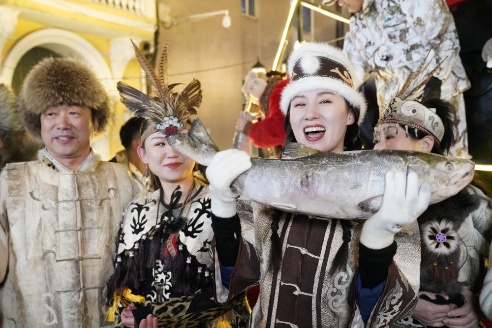 ↑1月6日,身著赫哲族服飾的饒河縣文旅推薦官在哈爾濱中央大街上推介家鄉(xiāng)特產(chǎn)魚(yú)品。