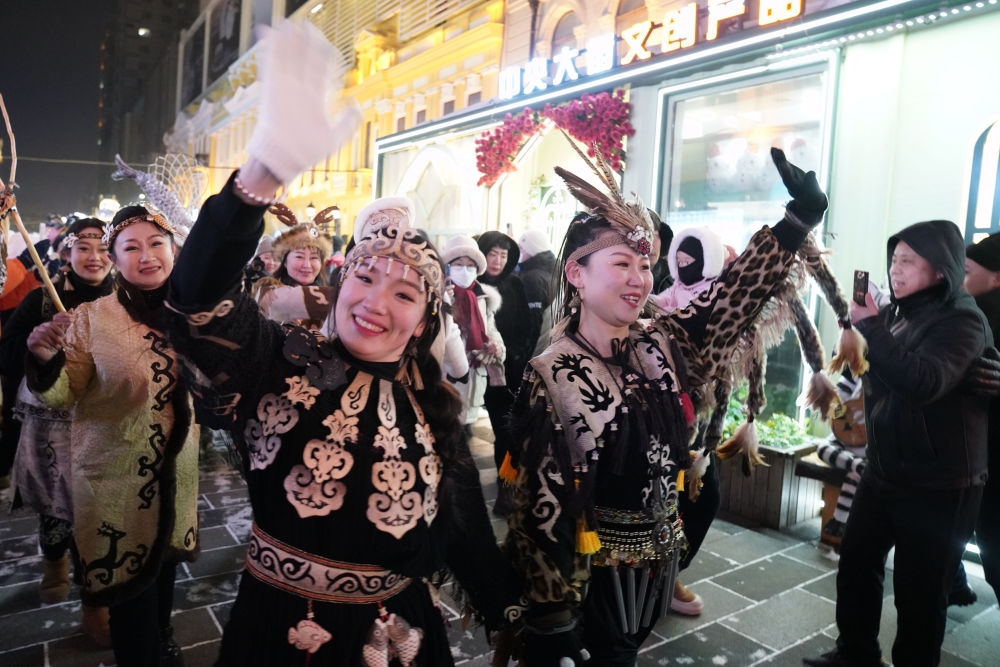 ↑1月6日,身著赫哲族服飾的赫哲族群眾在哈爾濱中央大街上與游客互動(dòng)。