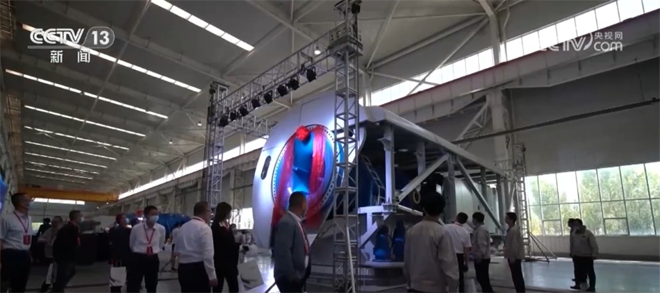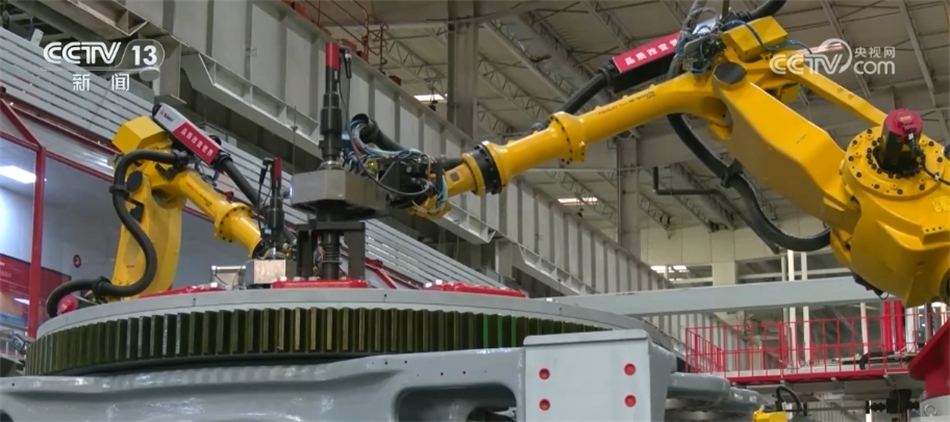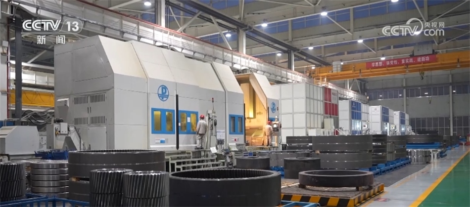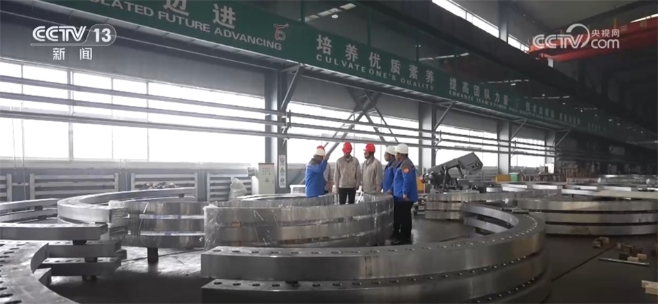 總臺(tái)央視記者 古峻嶺:這個(gè)大家伙叫輪轂,就是風(fēng)機(jī)葉輪中間這個(gè)位置,就是它把重達(dá)百噸的3支葉片牢牢固定在風(fēng)機(jī)之上。采用傳統(tǒng)人工的方式,需要2個(gè)人花上180分鐘才能安裝完,現(xiàn)在只需要80分鐘即可完成。傳統(tǒng)定點(diǎn)裝配模式一天只能裝配3—4臺(tái)主機(jī),而在現(xiàn)在的流水線上作業(yè),一天則可以裝配6—8臺(tái)主機(jī),效率翻倍,但是用工卻減少了一半。