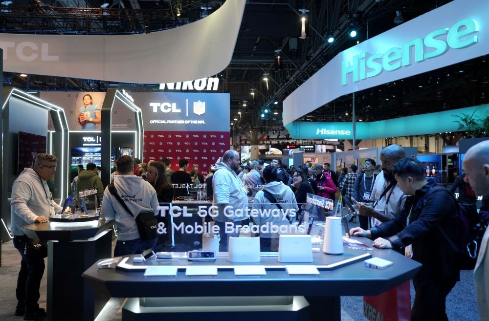 2024年1月11日,人們在美國拉斯維加斯消費(fèi)電子展上參觀TCL公司(左)和海信公司(右)展臺。新華社記者 吳曉凌 攝