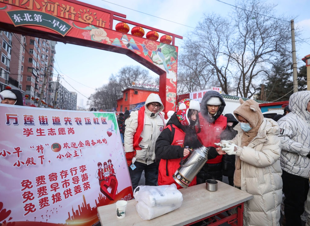 ?2024年1月21日,在遼寧沈陽小河沿早市,志愿者為游客提供免費(fèi)熱水。新華社記者 龍雷 攝