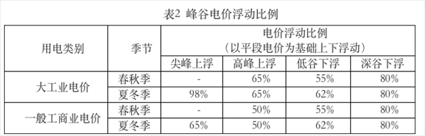 ?。ㄈ┱{(diào)整峰谷電價浮動比例,具體見表2。浮動比例以平段電價為基礎(chǔ),平段電價包含上網(wǎng)電價、上網(wǎng)環(huán)節(jié)線損費用、系統(tǒng)運行費用、輸配電價(不含容(需)電價)、政府性基金及附加。