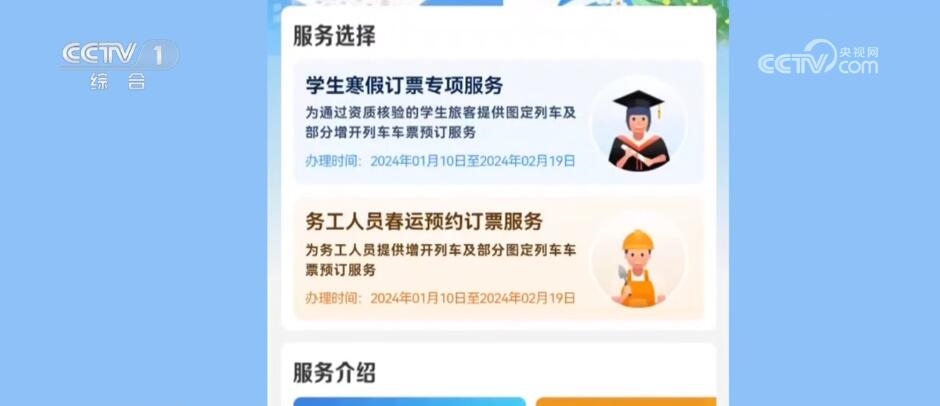 今年春運,鐵路部門推出預約購票和預填購票兩項購票新方式,預約購票功能專門針對學生和務工人員。符合條件的學生旅客(已通過學生優(yōu)惠資質核驗且有剩余優(yōu)惠乘車次數)可通過“學生寒假訂票專項服務”專區(qū)預約購買春運期間的火車票。已通過實名制核驗的務工人員可通過“務工人員春運預約訂票服務”專區(qū)預約購買春運期間火車票。
